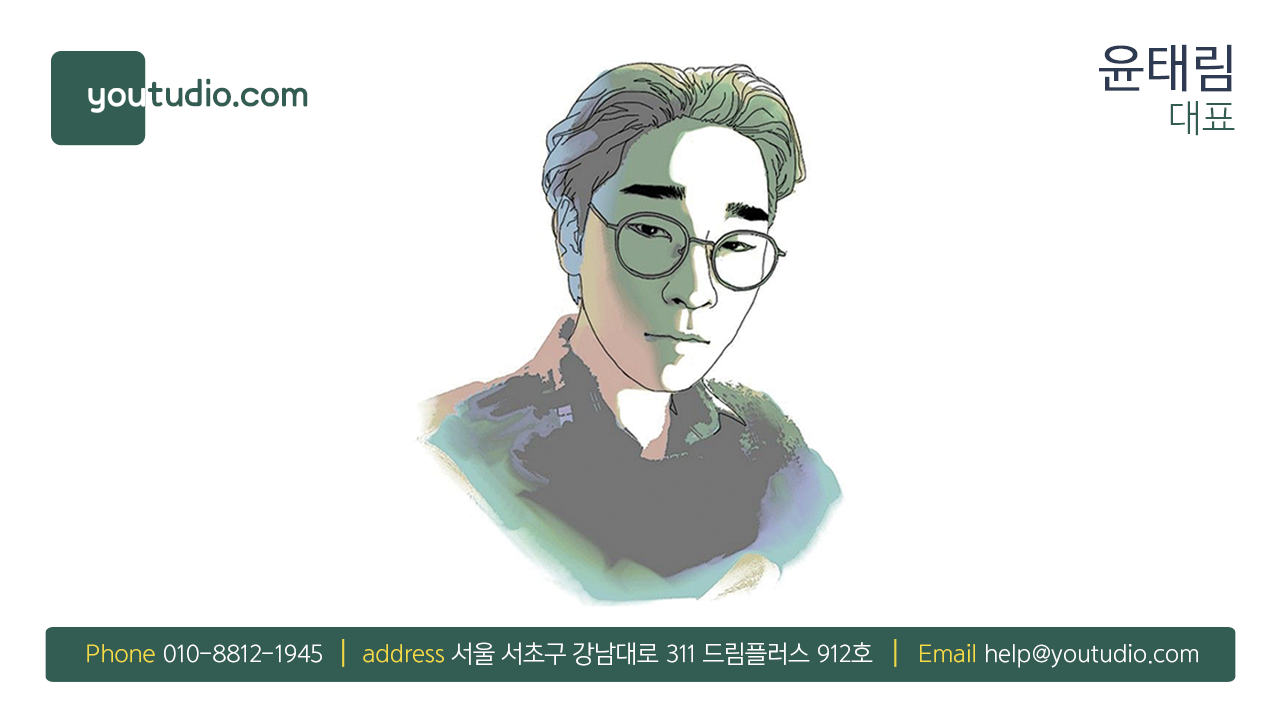 상호명: 주식회사유튜디오 ㅣ 사업자번호 : 266 81 01971EMAIL : help@youtudio.comㅣ 주소 : 서울시 송파구 송파대로 167 923-2호